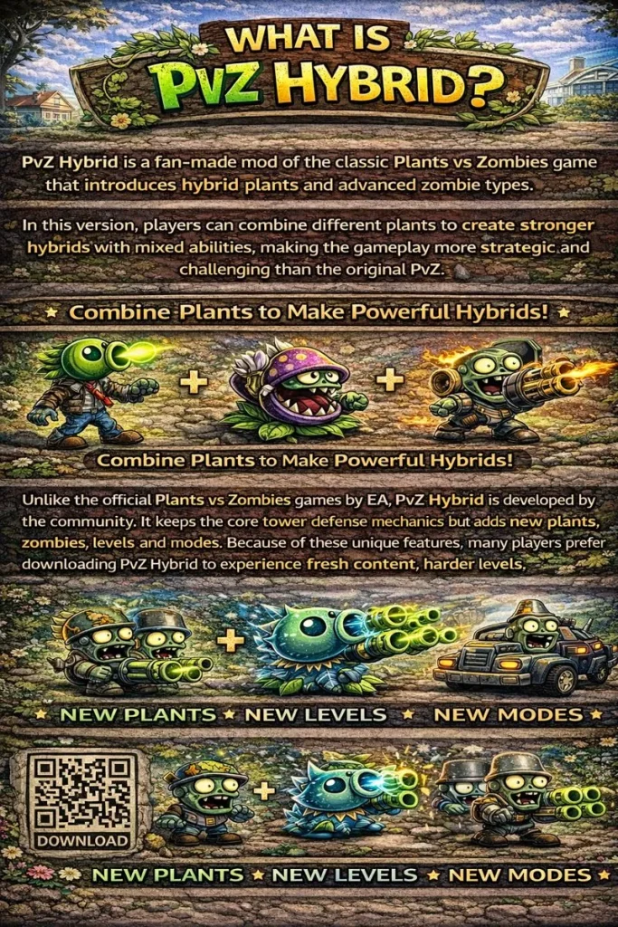 PvZ Hybrid is a popular fan-made version of Plants vs Zombies that adds hybrid plants, stronger zombies, and new gameplay mechanics. Many players search for PvZ Hybrid download because it offers more challenge and creativity than the original game. If you’re looking for the latest PvZ Hybrid version to play on PC or Android, you’re in the right place.